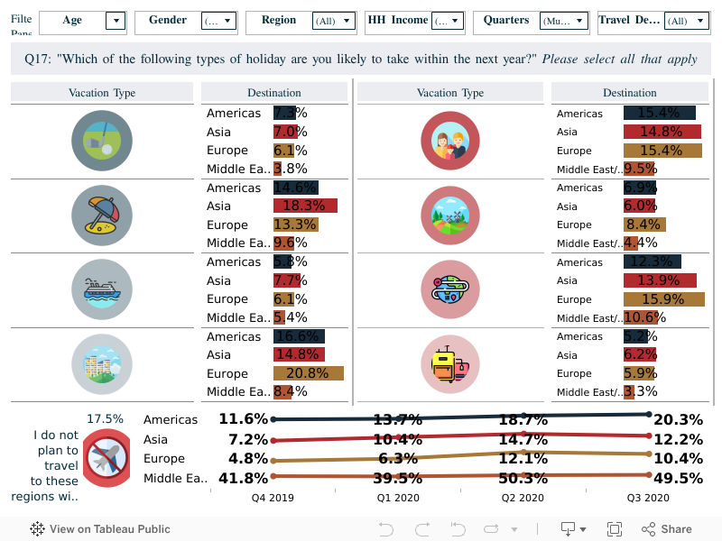 Different holiday types see wide variance in popularity across the regions, but all types have seen a downturn in interest for 2020. Cruises in particular have been negatively impacted by Coronavirus, with a reduced interest in this type of holiday when compared to pre-Covid levels. City breaks in Europe and the US have also been hit particularly badly, a likely reflection of travellers’ ongoing concerns about being in overcrowded places where their exposure to Coronavirus is elevated. Sightseeing/tourist holidays, and family holidays within Europe continue to see a considerable drop in interest against pre-Covid levels.