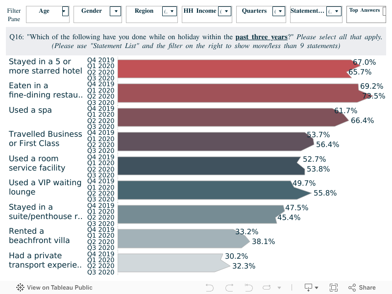 Luxury remains important right from the start of our respondents’ holidays, including at the airport: 53% travelled by business or first-class and 52% used a VIP waiting lounge as per the Q3 data. 5* or more hotels have remained popular with affluent travellers, used by 67% of our quarterly sample, while 46% stayed in a suite/penthouse roomand 36% rented a beachfront villa. Room services/concierges also appeal to many and were used by 54% as per Q3.