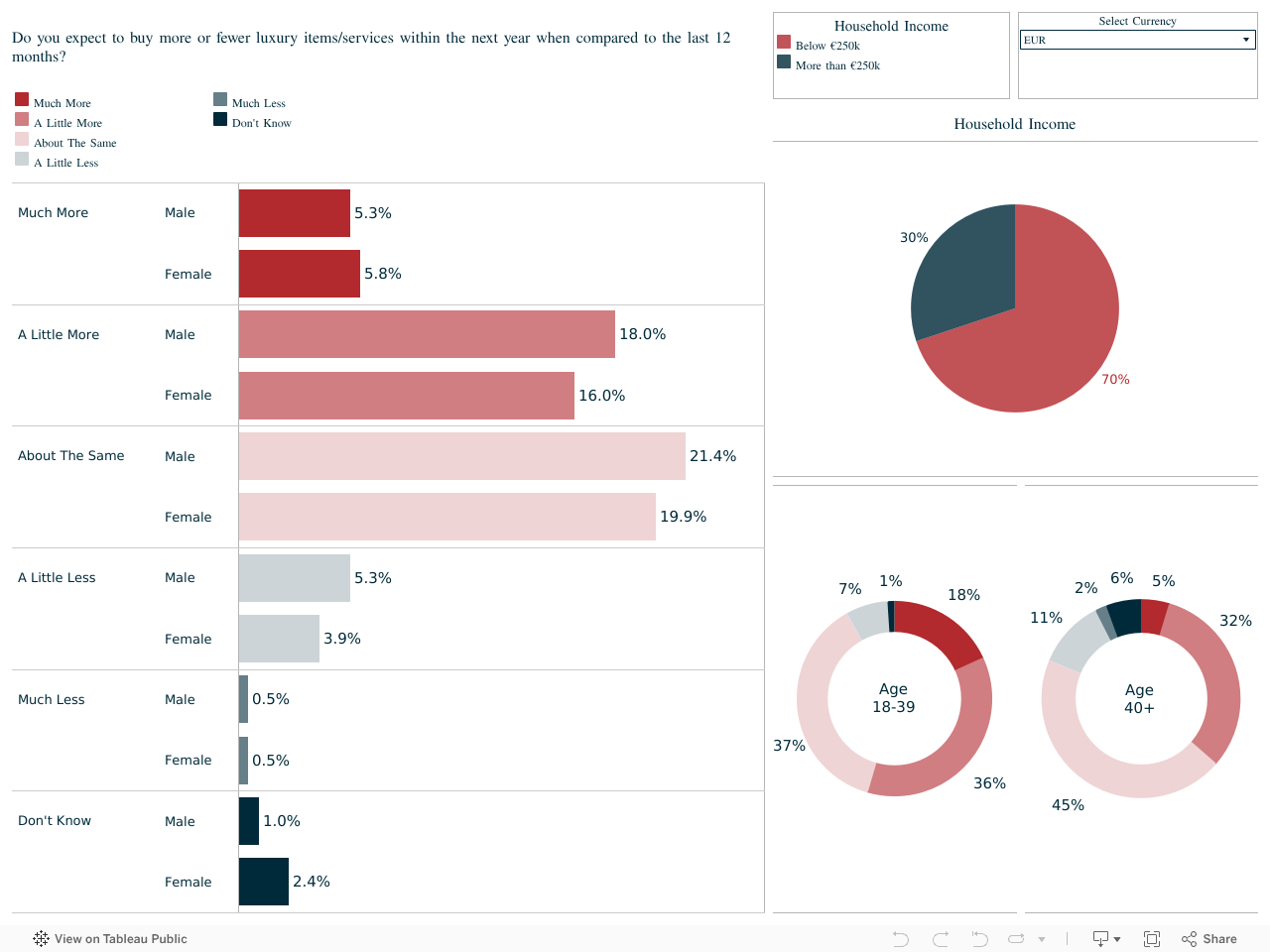 As of January, our European affluent/HNW respondents are often very positive about their projected luxury spending habits for 2019. 45% expect to spend more than they did last year, while only 10% anticipate cutting back. 18-39s are much more likely than the older cohort to expect to expect to buy many more luxury items/services (18% vs 5%), while over-40s are more likely to expect to buy about the same. There are no significant differences by gender for luxury purchase intentions next year.