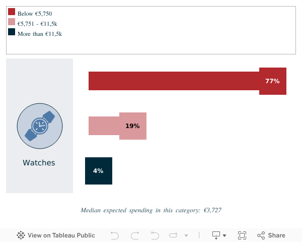 Watches (n=188): A third (33%) of our affluent European respondents would not be prepared to break the €1,150 mark on a new luxury watch, rising to 38% among over-40s. However, almost a quarter (23%) are willing to spend more than €5,750 on a new luxury watch, indicating that the ultra-premium watch segment has a number of willing customers. 18-39s are the most likely age group to be big spenders on a new high-end watch (27%).
